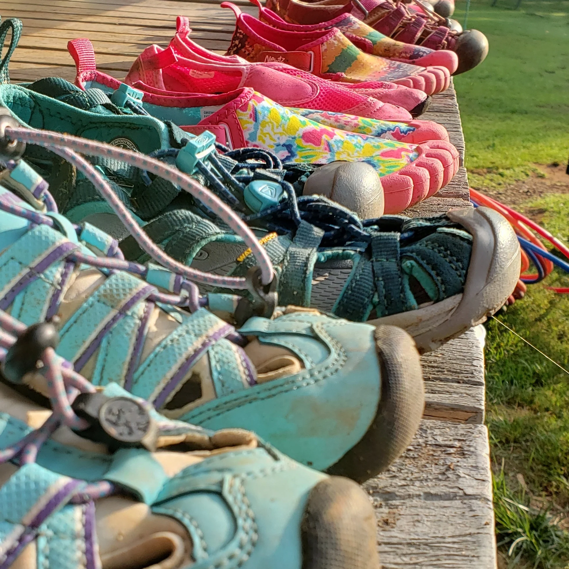 Old tennis shoes or water shoes are perfect. The shoes must be closed-toed and have a back strap. Girls who do not have an extra pair of shoes for wading will not be permitted in the river.
