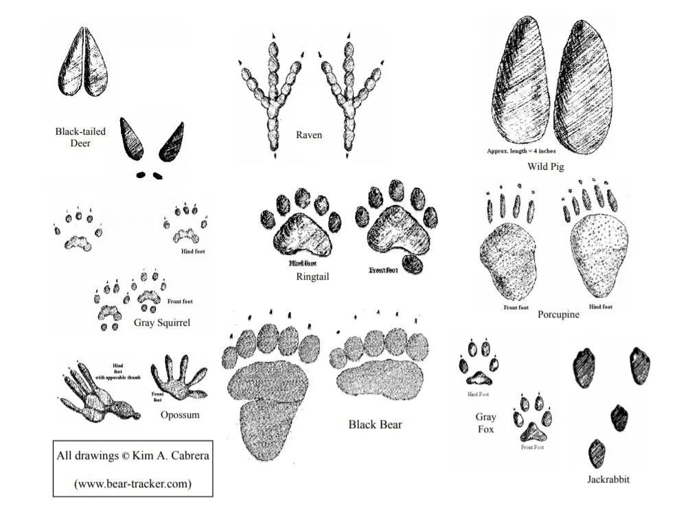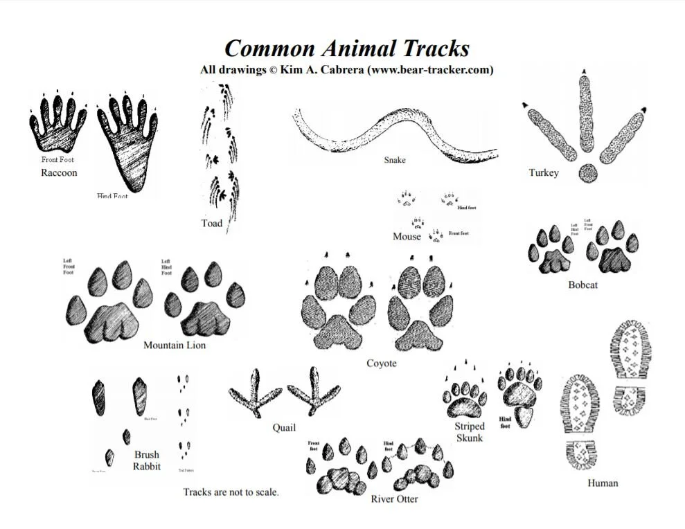 As you start to go for hikes and camp outdoors, look for clues to discover what animals live in your area! One way to find out about your local wildlife is to look for tracks using picture guides, like this one: